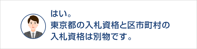 A:いいえ。入札資格は自治体ごとに必要です。東京都の入札に参加したいのであれば、「東京都の資格」、埼玉県の入札に参加したいのであれば、「埼玉県の資格」が必要です。