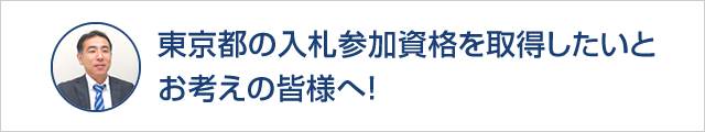 弊所は、東京都の入札参加資格の代行申請を専門に行う行政書士事務所です。いうなれば東京都入札参加資格の申請のプロです。いままで、いくつもの会社の入札参加資格を代理取得してきました。